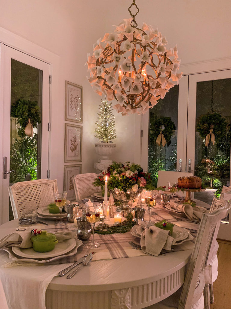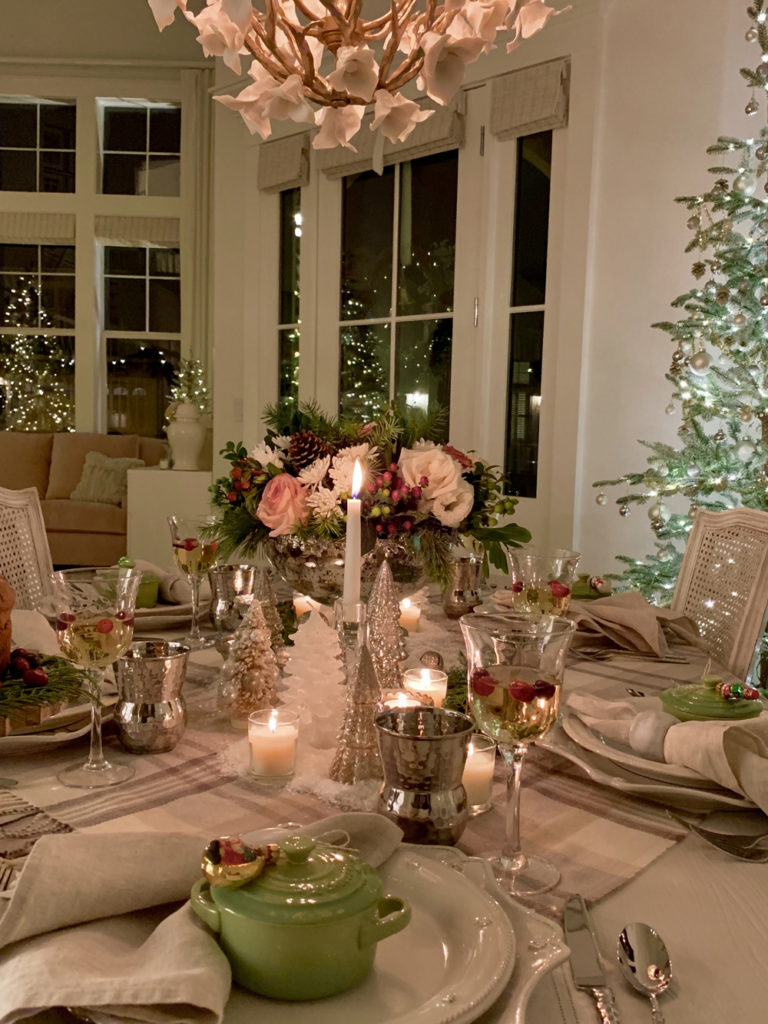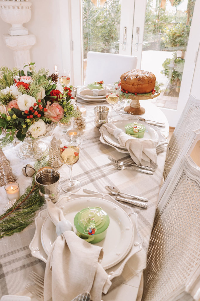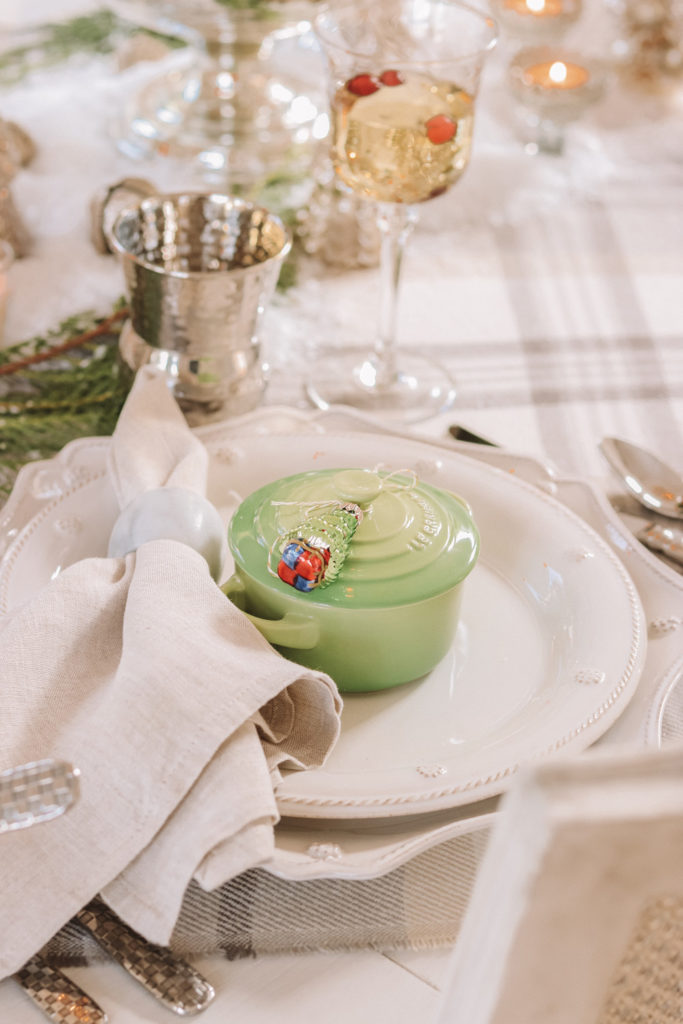 I made the table one of the spaces for gifting. At each place setting my guests were given a ‘palm‘ colored mini round cocotte with a little ornament attached for them to take home! They are the perfect special piece for every table setting and the color palm compliments all the holiday greenery in the house. Plus they are so cute! Technically they can be used to serve single portions of a side dish (like soup or dessert), but I like to use them in a multitude of ways.. as hostess gifts, candy bowls, etc. They come in 13 colors and sell at a great price point! {Click here to shop the mini round cocottes.}