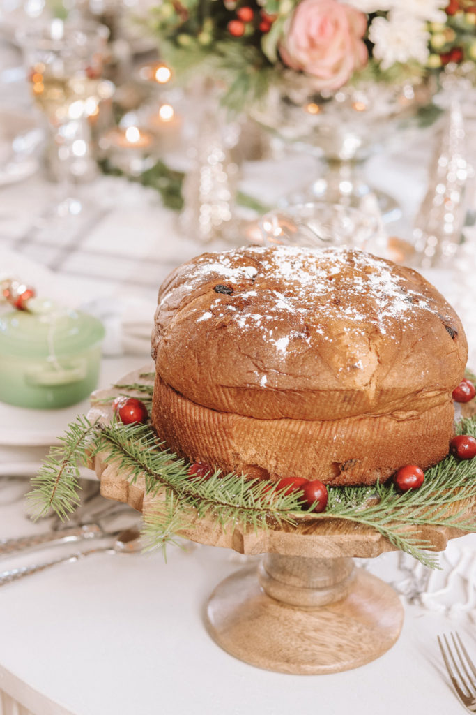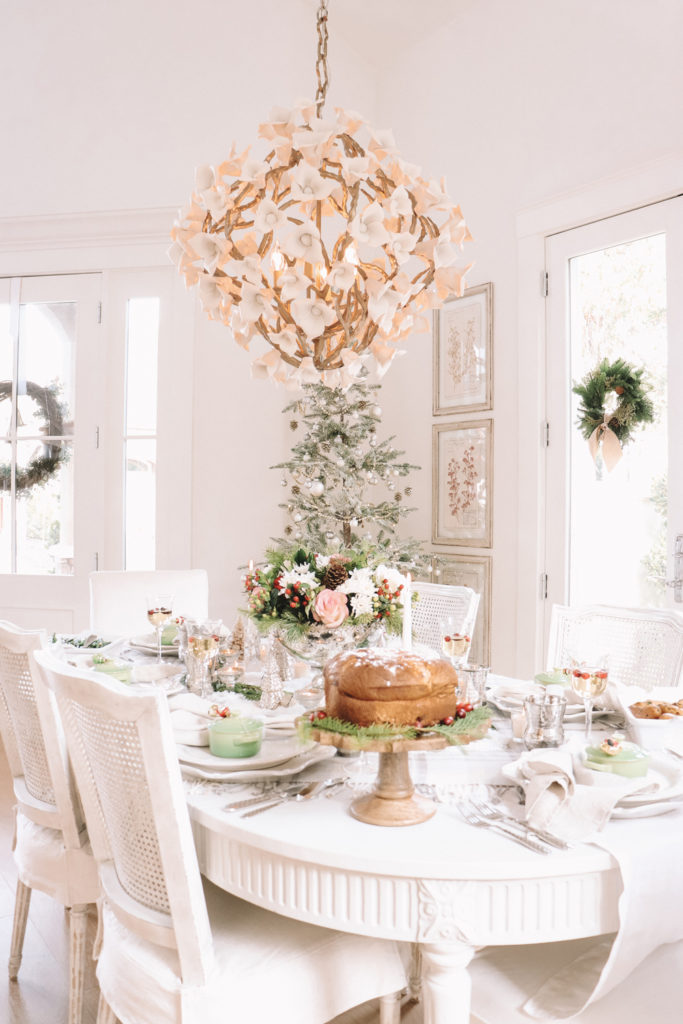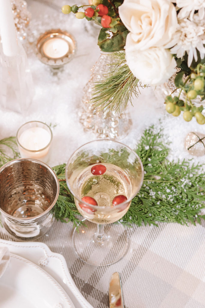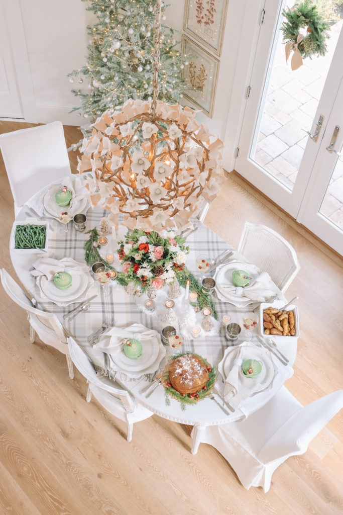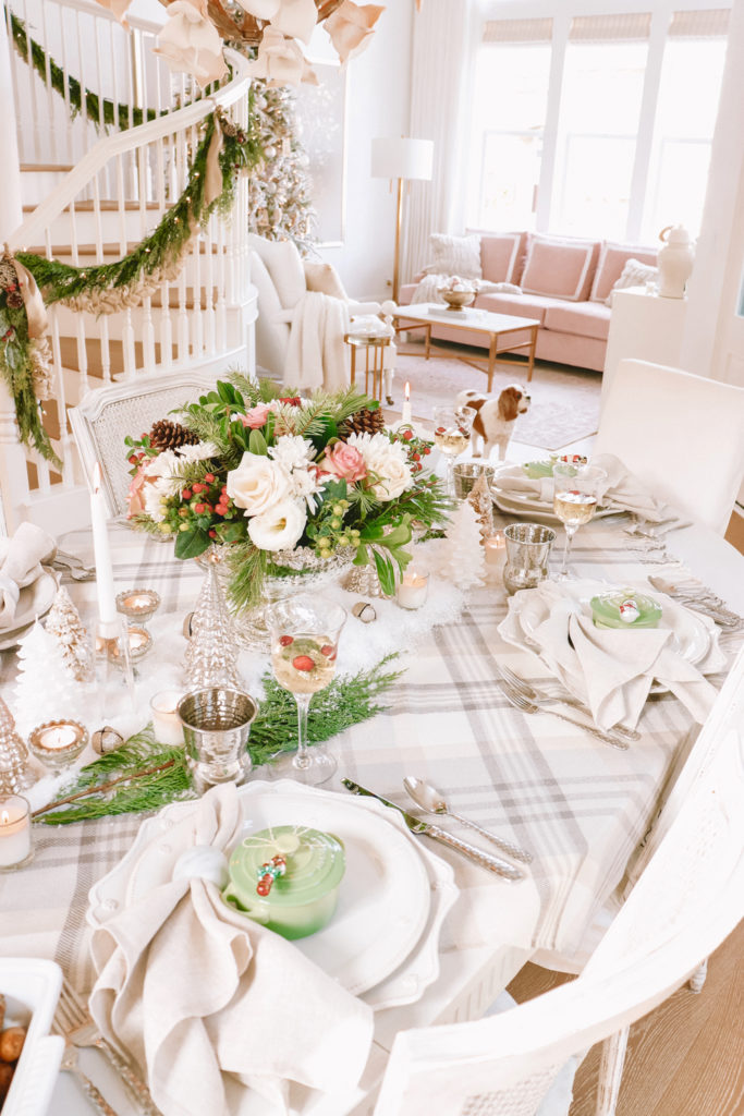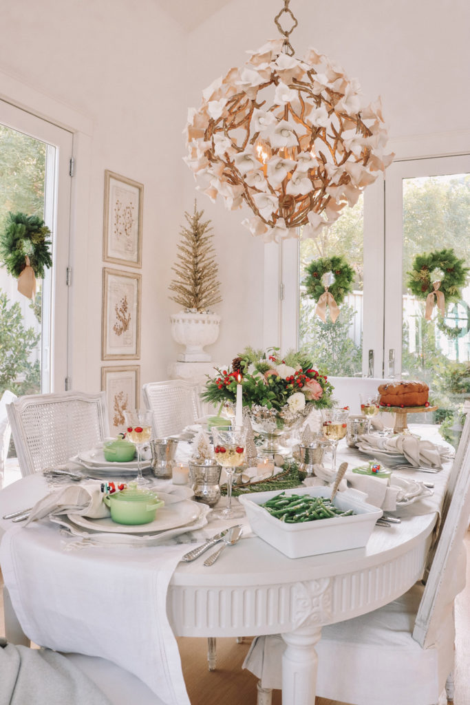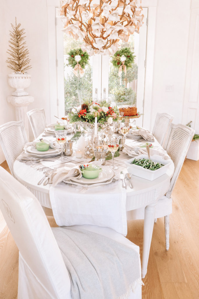 Acting as a centerpiece for the table, I designed a large floral arrangement using a beautiful mercury urn. The arrangement was inspired by the traditional colors of Christmas – a theme which I carried through the entire dinner party. On both ends of the table, Jeff served up two delicious sides in matching White Heritage Square Casserole dishes. Jeff loves these square casserole dishes because they are the perfect size for our family. {Click here to shop the dishes.}