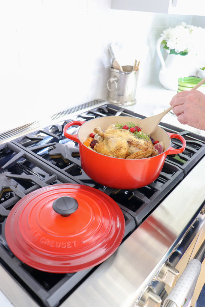 Surrounding the live Christmas tree is a delicious spread of appetizers and wine to enjoy while we all keep Jeff company in the kitchen. Of course, Jeff was hovering over his beautiful roasted chicken and vegetables inside the larger, 5 1/2 qt Round Dutch Oven. This Dutch Oven is in the color ‘Cerise‘. {Click here to shop Jeff’s round dutch oven}.